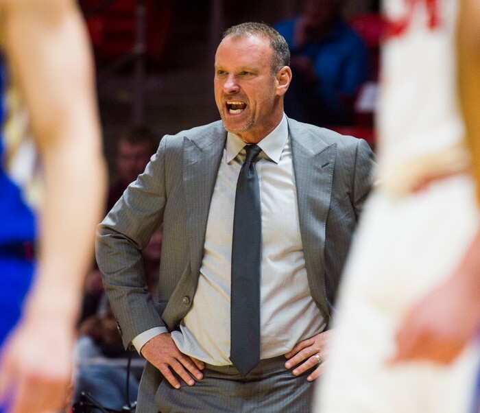 (Rick Egan | The Salt Lake Tribune) Utah Utes head coach Larry Krystkowiak reacts after a call by the official, in basketball action between, Utah Utes and Tulsa Golden Hurricane, at the Jon M. Huntsman Center, Saturday, Dec. 1, 2018.
