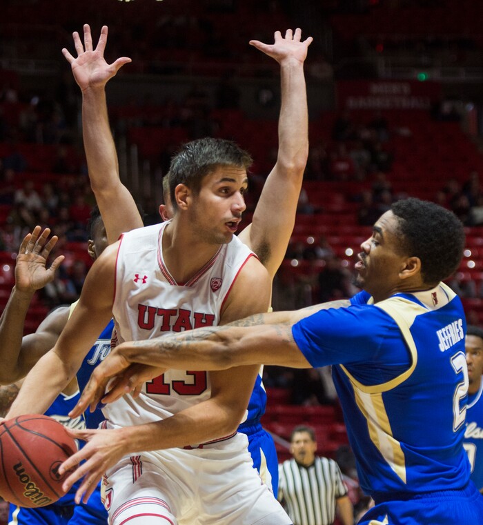(Rick Egan | The Salt Lake Tribune) Utah Utes forward Novak Topalovic (13) tries to pass the ball, as Tulsa guard DaQuan Jeffries (2) defends for the Golden Hurricane's, in basketball action between, Utah Utes and Tulsa Golden Hurricane, at the Jon M. Huntsman Center, Saturday, Dec. 1, 2018.