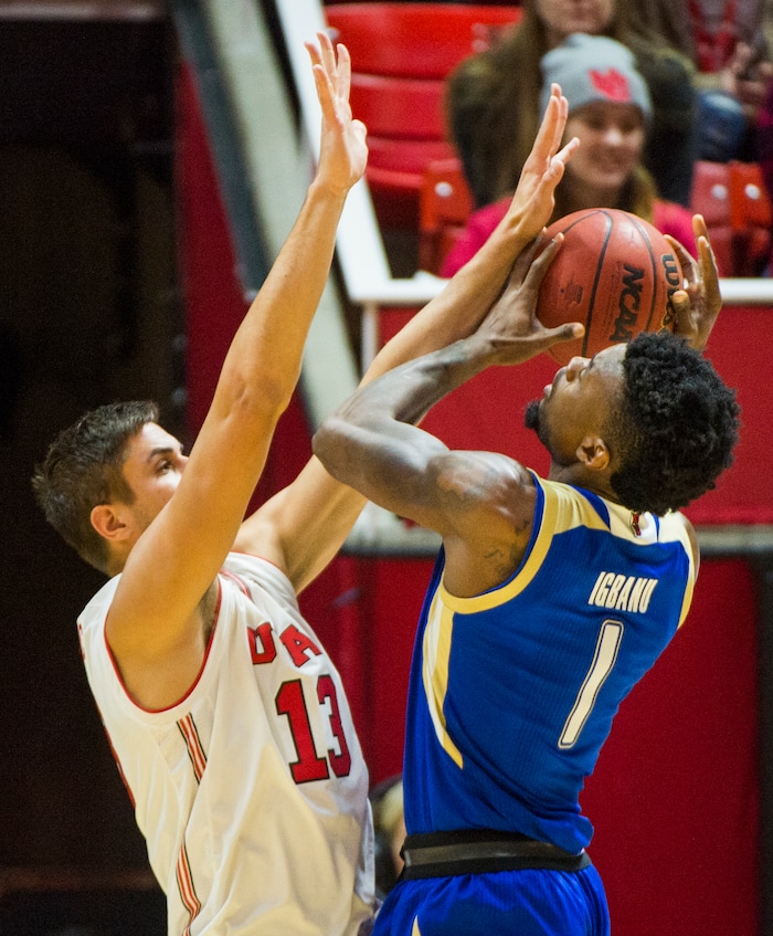 (Rick Egan | The Salt Lake Tribune) Tulsa Golden Hurricane forward Martins Igbanu (1) shoots as Utah Utes forward Novak Topalovic (13) defends, , in basketball action between, Utah Utes and Tulsa Golden Hurricane, at the Jon M. Huntsman Center, Saturday, Dec. 1, 2018.