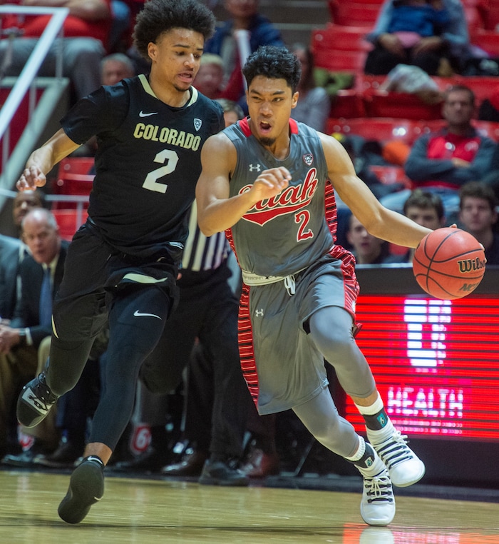 (Rick Egan | The Salt Lake Tribune) Utah Utes guard Sedrick Barefield (2) gets past Colorado Buffaloes guard Daylen Kountz (2), in PAC-12 basketball action between the Utah Utes and the Colorado Buffaloes at the Jon M. Huntsman Center, Sunday, Jan. 20, 2019.