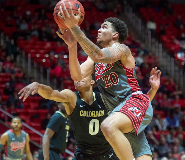 (Rick Egan | The Salt Lake Tribune) Utah Utes forward Timmy Allen (20) goes in for two as Colorado Buffaloes guard Daylen Kountz (2) defends, in PAC-12 basketball action between the Utah Utes and the Colorado Buffaloes at the Jon M. Huntsman Center, Sunday, Jan. 20, 2019.