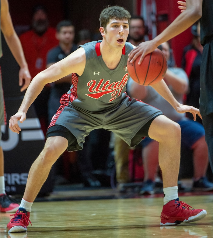 (Rick Egan | The Salt Lake Tribune) Utah forward Riley Battin (21) plays defense for the Utes, in PAC-12 basketball action between the Utah Utes and the Colorado Buffaloes at the Jon M. Huntsman Center, Sunday, Jan. 20, 2019.