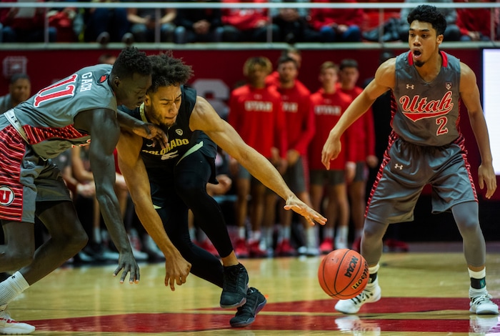 (Rick Egan | The Salt Lake Tribune) Utah Utes forward Both Gach (11) tips the ball away from Colorado Buffaloes guard D'Shawn Schwartz (5), as Utah Utes guard Sedrick Barefield (2) looks on, in PAC-12 basketball action between the Utah Utes and the Colorado Buffaloes at the Jon M. Huntsman Center, Sunday, Jan. 20, 2019.