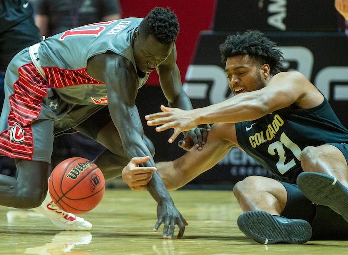 (Rick Egan | The Salt Lake Tribune) Utah Utes forward Both Gach (11) tips the ball away from Colorado Buffaloes guard D'Shawn Schwartz (5), in PAC-12 basketball action between the Utah Utes and the Colorado Buffaloes at the Jon M. Huntsman Center, Sunday, Jan. 20, 2019.