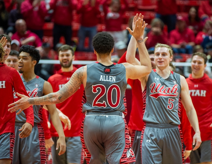 (Rick Egan | The Salt Lake Tribune) Utah Utes forward Timmy Allen (20) celebrates after the Utes jump out to a double digit lead early in the game, on back to back dunks, in PAC-12 basketball action between the Utah Utes and the Colorado Buffaloes at the Jon M. Huntsman Center, Sunday, Jan. 20, 2019.