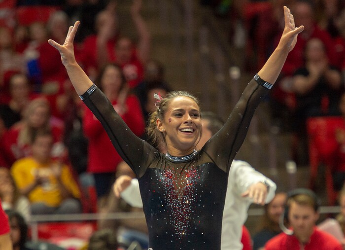 (Rick Egan | The Salt Lake Tribune) Macery Roberts reacts after her routine on the floor for Utah, in PAC-12 gymnastics action between the UCLA Bruins and the University of Utah, at the Jon M. Huntsman Center, Saturday, Feb. 23, 2019.