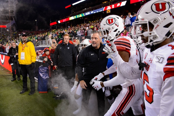 Kyle Whittingham leads his team onto the field as Utah faces Oregon in the Pac-12 football championship game in Santa Clara, Calif., on Friday Dec. 6, 2019.