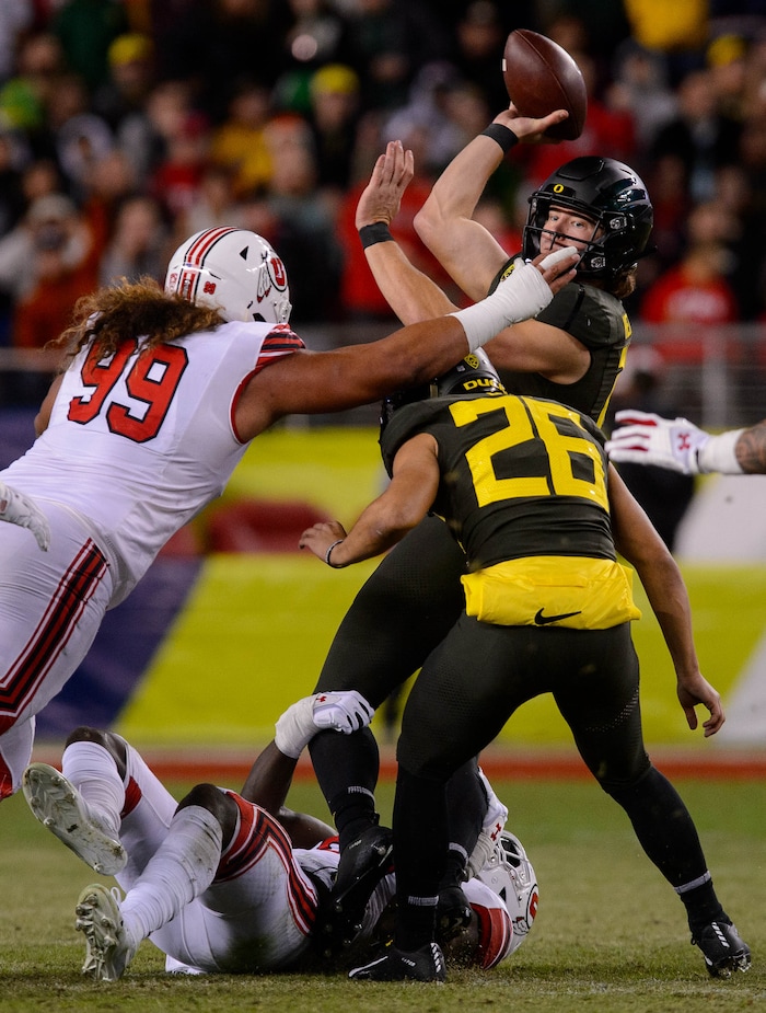 Oregon Ducks quarterback Justin Herbert (10) is pressured by Utah Utes defensive end Mika Tafua (42) and Utah Utes defensive end Bradlee Anae (6) as Utah faces Oregon in the Pac-12 football championship game in Santa Clara, Calif., on Friday Dec. 6, 2019.