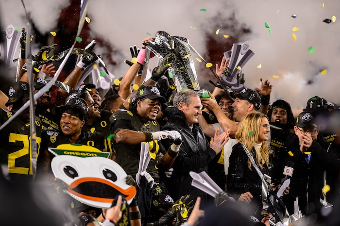 Oregon players celebrate the championship as Utah faces Oregon in the Pac-12 football championship game in Santa Clara, Calif., on Friday Dec. 6, 2019.