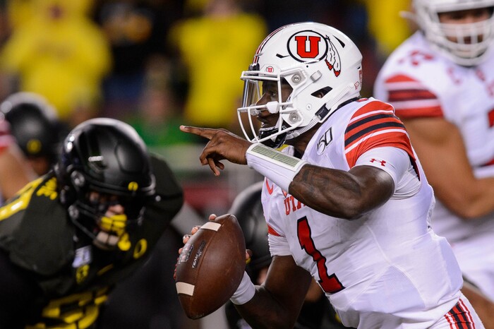 Utah Utes quarterback Tyler Huntley (1) as Utah faces Oregon in the Pac-12 football championship game in Santa Clara, Calif., on Friday Dec. 6, 2019.