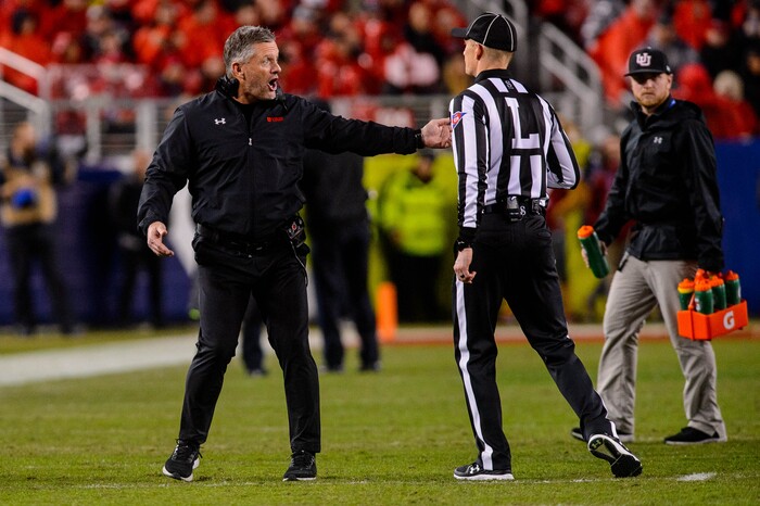 Kyle Whittingham reacts to a call as Utah faces Oregon in the Pac-12 football championship game in Santa Clara, Calif., on Friday Dec. 6, 2019.
