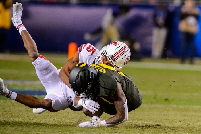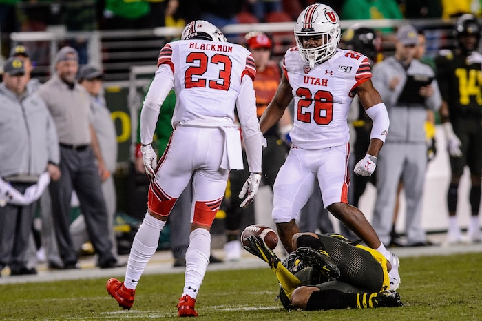 Utah Utes defensive back Julian Blackmon (23) looks down after tackling Oregon Ducks wide receiver Johnny Johnson III (3) as Utah faces Oregon in the Pac-12 football championship game in Santa Clara, Calif., on Friday Dec. 6, 2019.