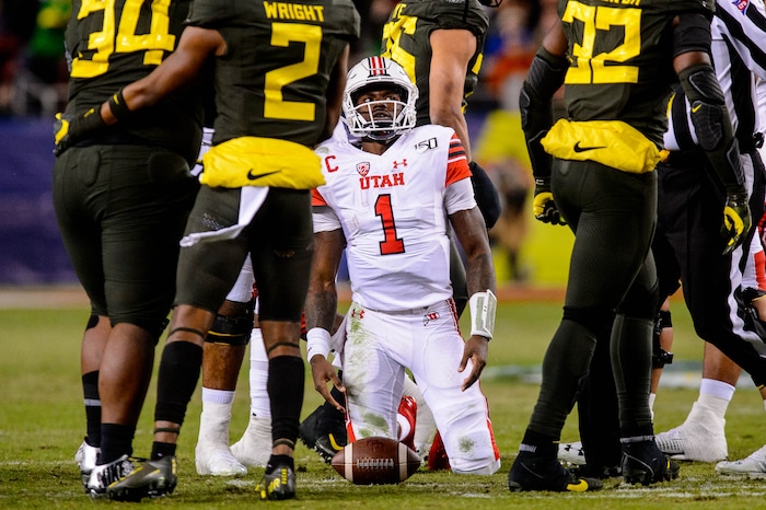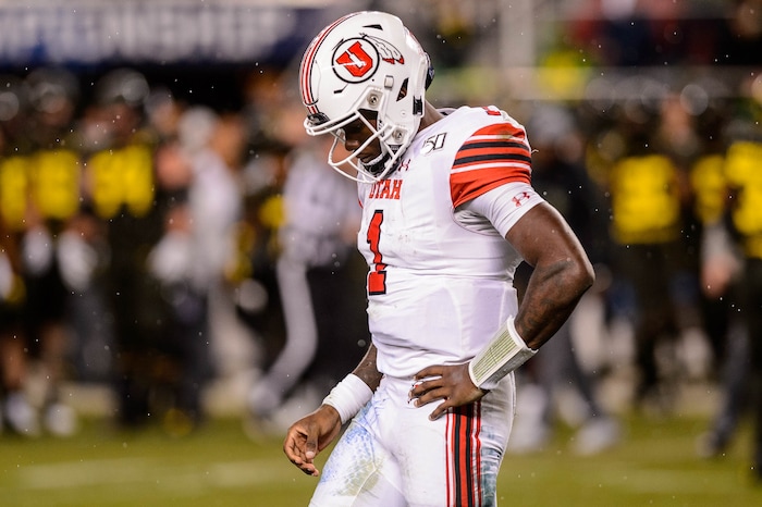 Utah Utes quarterback Tyler Huntley (1) on the sideline after a first half Oregon touchdown as Utah faces Oregon in the Pac-12 football championship game in Santa Clara, Calif., on Friday Dec. 6, 2019.