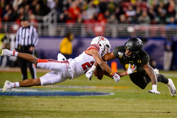 Utah Utes wide receiver Jaylen Dixon (25) and Oregon Ducks safety Jevon Holland (8) dive for the ball as Utah faces Oregon in the Pac-12 football championship game in Santa Clara, Calif., on Friday Dec. 6, 2019.