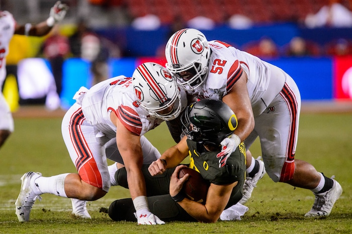 Utah Utes defensive end Bradlee Anae (6) and Utah Utes defensive tackle John Penisini (52) sack Oregon Ducks quarterback Justin Herbert (10) as Utah faces Oregon in the Pac-12 football championship game in Santa Clara, Calif., on Friday Dec. 6, 2019.