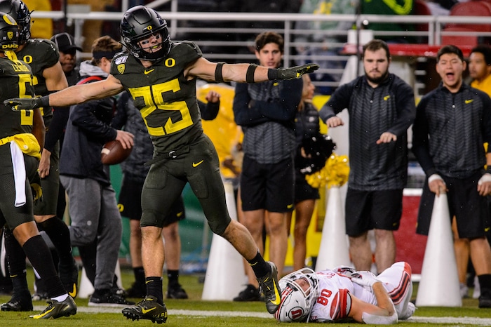 Oregon Ducks safety Brady Breeze (25) signals incomplete over Utah Utes tight end Brant Kuithe (80) as Utah faces Oregon in the Pac-12 football championship game in Santa Clara, Calif., on Friday Dec. 6, 2019.