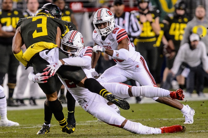 Utah Utes defensive back Julian Blackmon (23) tackles Oregon Ducks wide receiver Johnny Johnson III (3) as Utah faces Oregon in the Pac-12 football championship game in Santa Clara, Calif., on Friday Dec. 6, 2019.