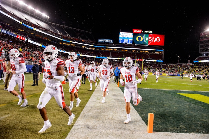 Utah players run off the field at halftime, trailing 0-20 as Utah faces Oregon in the Pac-12 football championship game in Santa Clara, Calif., on Friday Dec. 6, 2019.