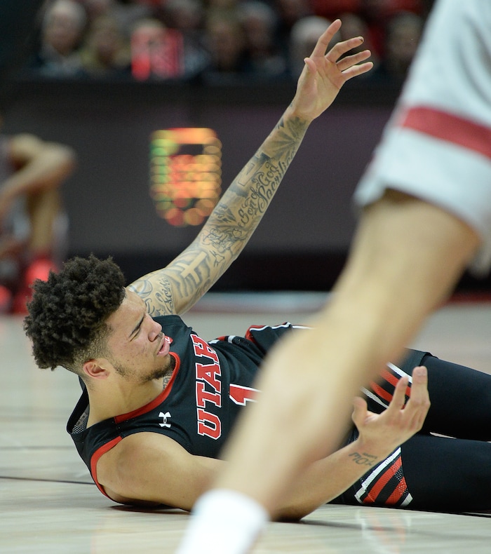 (Francisco Kjolseth | The Salt Lake Tribune) Utah Utes forward Timmy Allen (1) gets tripped up on drive as the University of Utah hosts Stanford in NCAA menÕs basketball, Thursday, Feb. 6, 2020, at the Jon M. Huntsman Center in Salt Lake City.