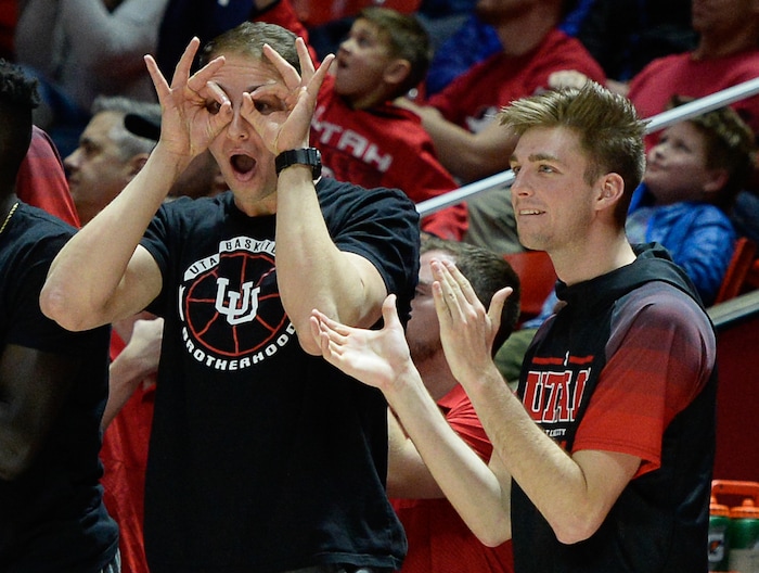 (Francisco Kjolseth | The Salt Lake Tribune) The Utah bench cheers on their team as the game goes into overtime as the University of Utah hosts Stanford in NCAA menÕs basketball, Thursday, Feb. 6, 2020, at the Jon M. Huntsman Center in Salt Lake City. The Utes went on to beat Stanford in overtime 64-56.