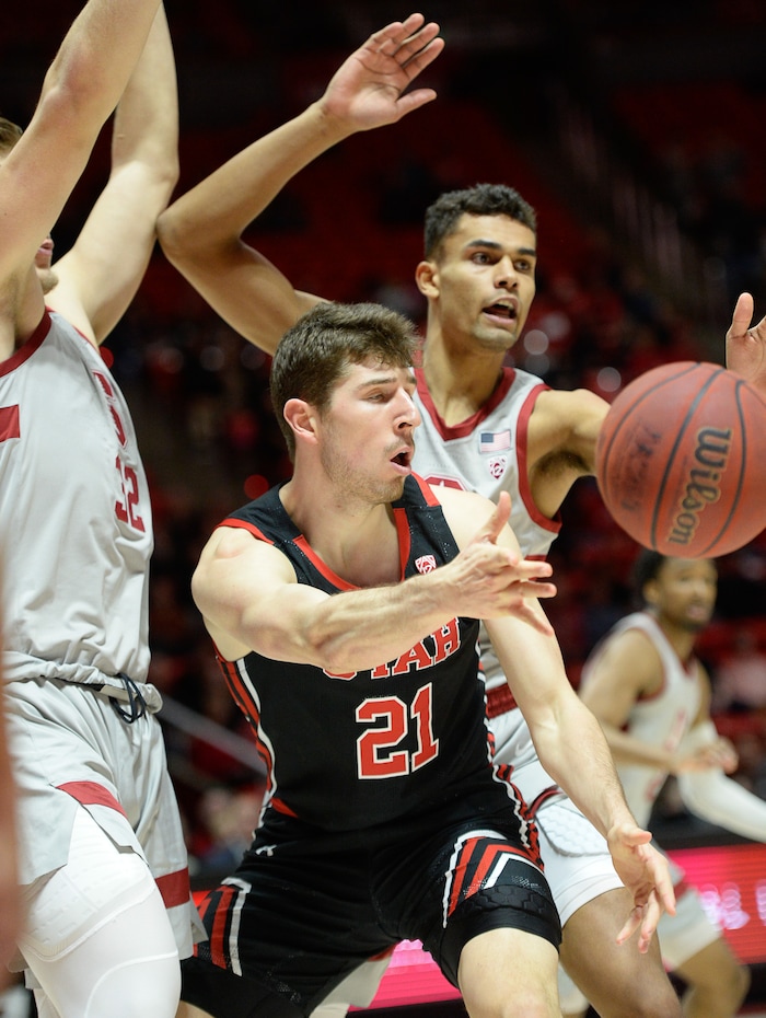 (Francisco Kjolseth | The Salt Lake Tribune) Utah Utes forward Riley Battin (21) passes to a teammate as the University of Utah hosts Stanford in NCAA menÕs basketball, Thursday, Feb. 6, 2020, at the Jon M. Huntsman Center in Salt Lake City.