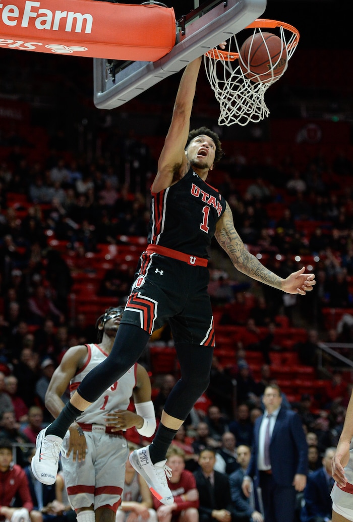 (Francisco Kjolseth | The Salt Lake Tribune) Utah Utes forward Timmy Allen (1) puts in a monster dunk passed by Utah Utes guard Rylan Jones (15) as the University of Utah hosts Stanford in NCAA menÕs basketball, Thursday, Feb. 6, 2020, at the Jon M. Huntsman Center in Salt Lake City.