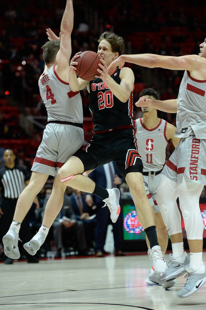 (Francisco Kjolseth | The Salt Lake Tribune) Utah Utes center Branden Carlson (35) brings helps bring Utah back in the final minutes as the University of Utah hosts Stanford in NCAA menÕs basketball, Thursday, Feb. 6, 2020, at the Jon M. Huntsman Center in Salt Lake City. The Utes went on to beat Stanford in overtime 64-56.