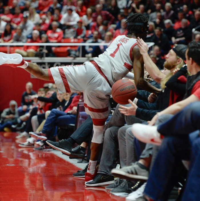 (Francisco Kjolseth | The Salt Lake Tribune) Stanford Cardinal guard Daejon Davis (1) chases down a ball in the stands as the University of Utah hosts Stanford in NCAA menÕs basketball, Thursday, Feb. 6, 2020, at the Jon M. Huntsman Center in Salt Lake City.