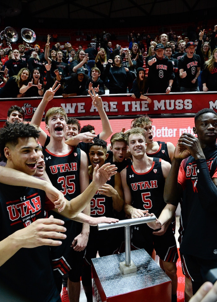 (Francisco Kjolseth | The Salt Lake Tribune) Utah celebrates their overtime win over Stanford 64-56 as they light up the U in NCAA menÕs basketball, Thursday, Feb. 6, 2020, at the Jon M. Huntsman Center in Salt Lake City.