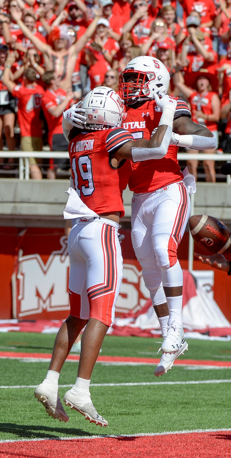 (Leah Hogsten | The Salt Lake Tribune) Utah Utes wide receiver Bryan Thompson (19) celebrates his 82 yard touchdown with Utah Utes running back Jordan Wilmore (5)as the University of UtahÕs RunninÕ Utes host Idaho State Bengals in Salt Lake City, Saturday, Sept. 14, 2019.