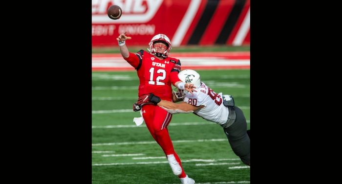(Rick Egan | The Salt Lake Tribune) Utah Utes quarterback Drew Lisk (12) throws a pass as Washington State Cougars defensive end Brennan Jackson (80) defends, in PAC-12 football acton between Utah Utes and Washington State Cougars at Rice-Eccles Stadium on Saturday, Dec. 19, 2020.