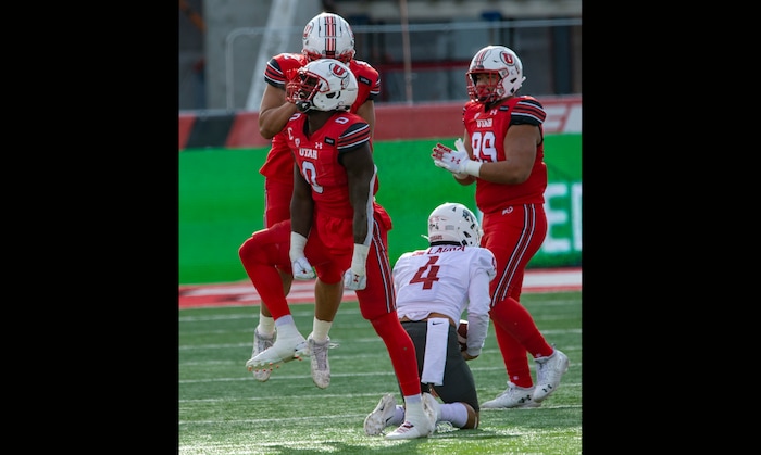 (Rick Egan | The Salt Lake Tribune) Utah Utes linebacker Devin Lloyd (0) reacts after a quarterback sack of Washington State Cougars quarterback Jayden de Laura (4), in PAC-12 football acton between Utah Utes and Washington State Cougars at Rice-Eccles Stadium on Saturday, Dec. 19, 2020.