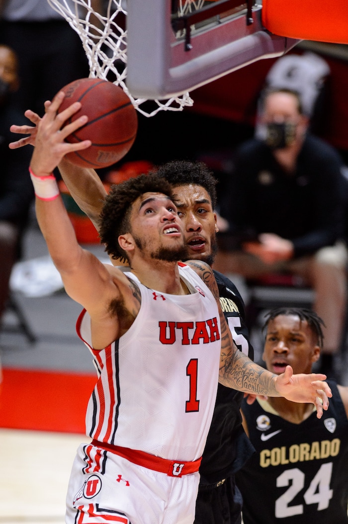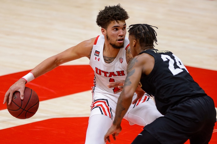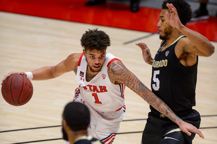(Trent Nelson | The Salt Lake Tribune) Utah Utes forward Timmy Allen (1) drives on Colorado Buffaloes guard D'Shawn Schwartz (5) as Utah hosts Colorado, NCAA basketball in Salt Lake City on Monday, Jan. 11, 2021.