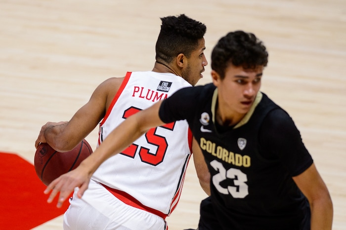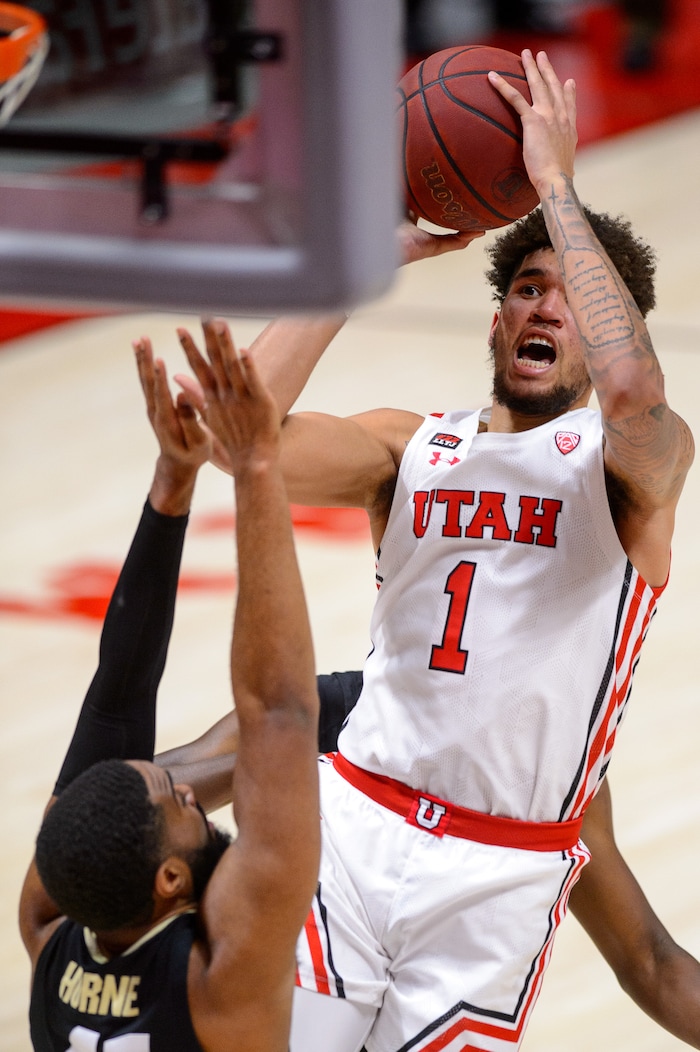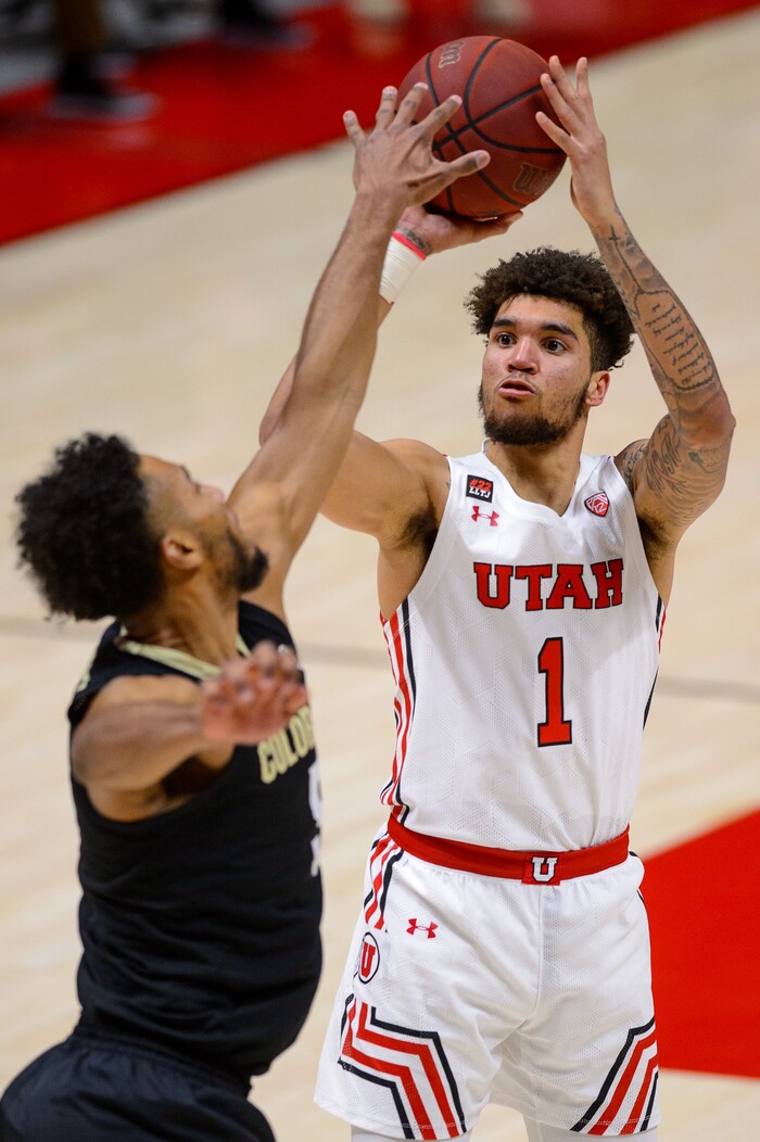(Trent Nelson | The Salt Lake Tribune) Utah Utes guard Alfonso Plummer (25) shoots as Utah hosts Colorado, NCAA basketball in Salt Lake City on Monday, Jan. 11, 2021.