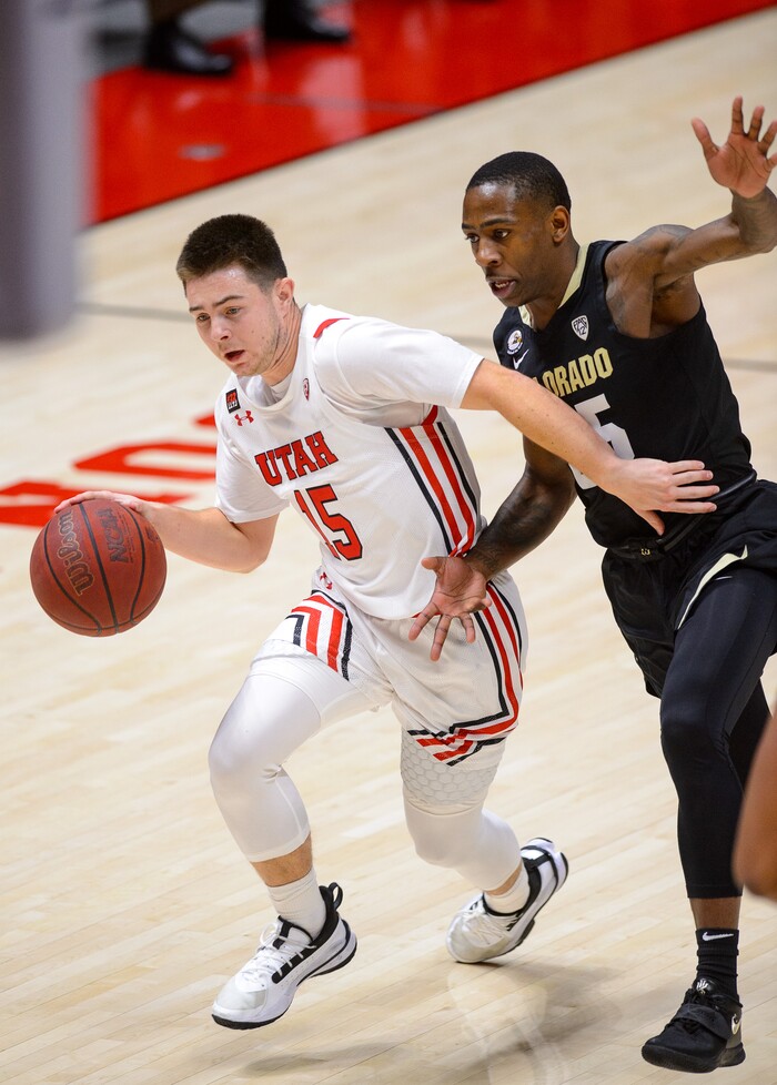 (Trent Nelson | The Salt Lake Tribune) Utah Utes guard Rylan Jones (15) defended by Colorado Buffaloes guard Keeshawn Barthelemy (11) as Utah hosts Colorado, NCAA basketball in Salt Lake City on Monday, Jan. 11, 2021.