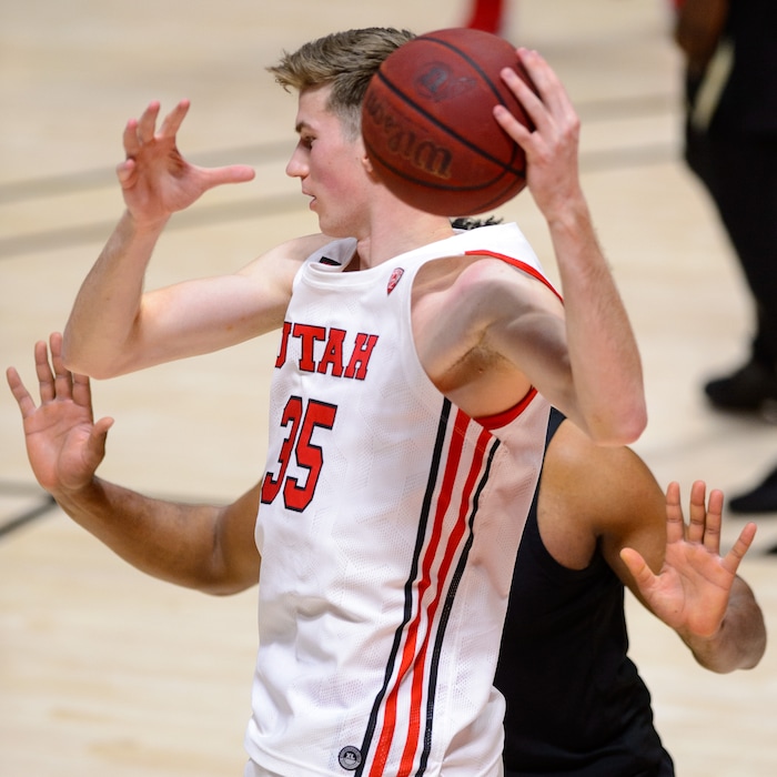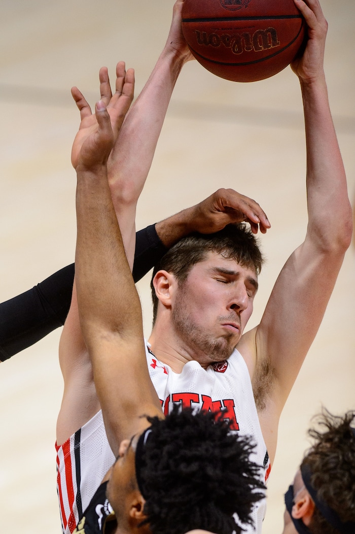 (Trent Nelson | The Salt Lake Tribune) Utah Utes center Branden Carlson (35) pulls in a rebound as Utah hosts Colorado, NCAA basketball in Salt Lake City on Monday, Jan. 11, 2021.