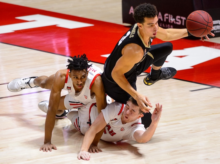 (Trent Nelson | The Salt Lake Tribune) Utah Utes guard Ian Martinez (2), Utah Utes guard Rylan Jones (15), and Colorado Buffaloes guard Maddox Daniels (3) scramble for a loose ball as Utah hosts Colorado, NCAA basketball in Salt Lake City on Monday, Jan. 11, 2021.