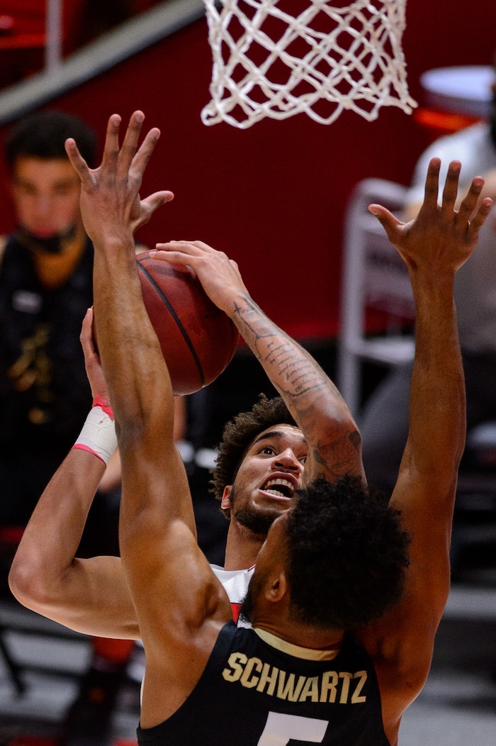 (Trent Nelson | The Salt Lake Tribune) Utah Utes forward Riley Battin (21) drives on Colorado Buffaloes guard D'Shawn Schwartz (5) as Utah hosts Colorado, NCAA basketball in Salt Lake City on Monday, Jan. 11, 2021.