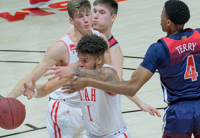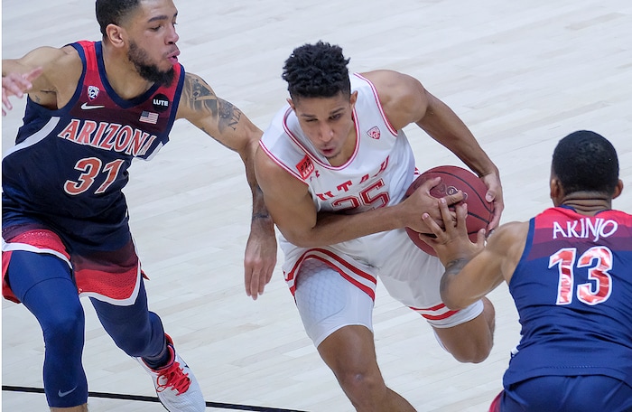 (Leah Hogsten | The Salt Lake Tribune) Utah Utes guard Alfonso Plummer (25) drives through Arizona Wildcats guard Terrell Brown Jr. (31) and Arizona Wildcats guard James Akinjo (13) as the University of Utah host the Arizona Wildcats, Feb. 4, 2021 at the Jon M. Huntsman Arena.