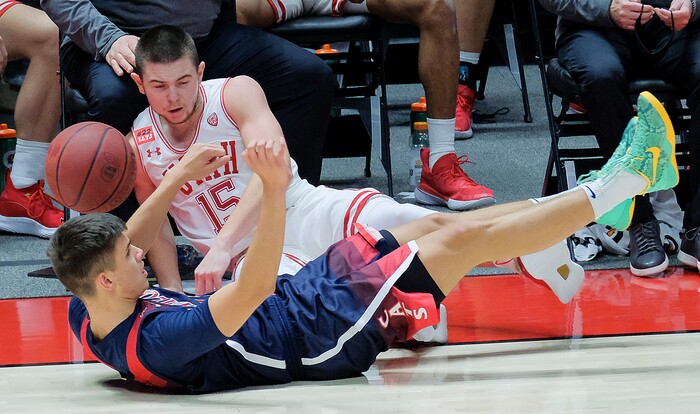 (Leah Hogsten | The Salt Lake Tribune) A foul is called on Utah Utes guard Rylan Jones (15) as he hits the deck with Arizona Wildcats guard Kerr Kriisa (25) as the University of Utah host the Arizona Wildcats, Feb. 4, 2021 at the Jon M. Huntsman Arena.
