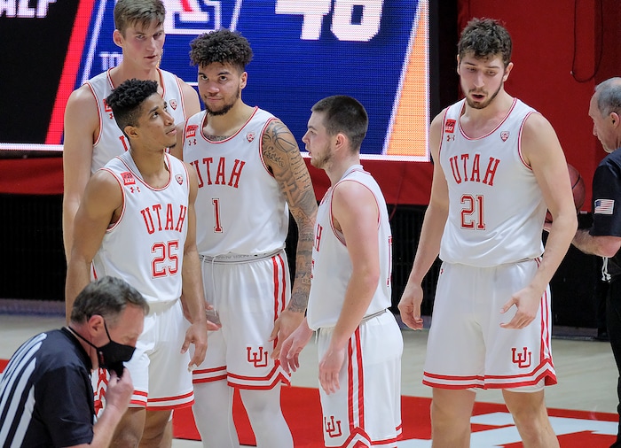 (Leah Hogsten | The Salt Lake Tribune) The Utes react as they get into foul trouble in the second half as the University of Utah host the Arizona Wildcats, Feb. 4, 2021 at the Jon M. Huntsman Arena.