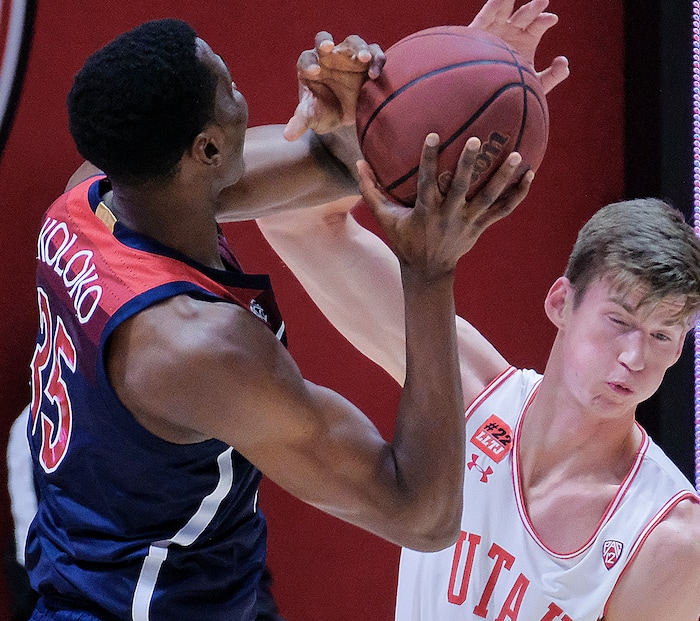 (Leah Hogsten | The Salt Lake Tribune) Utah Utes center Branden Carlson (35) battles Arizona Wildcats center Christian Koloko (35) under the net as the University of Utah host the Arizona Wildcats, Feb. 4, 2021 at the Jon M. Huntsman Arena.