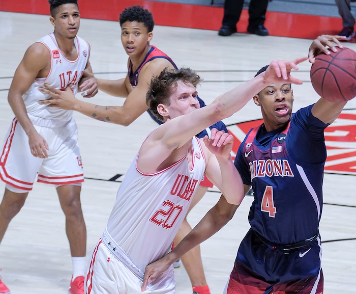 (Leah Hogsten | The Salt Lake Tribune) Utah Utes forward Mikael Jantunen (20) battles Arizona Wildcats guard Dalen Terry (4) for possession as the University of Utah host the Arizona Wildcats, Feb. 4, 2021 at the Jon M. Huntsman Arena.