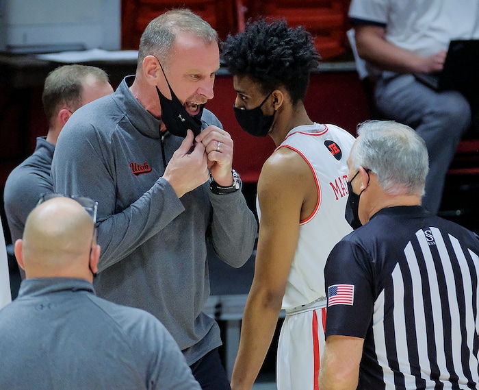 (Leah Hogsten | The Salt Lake Tribune) Utah Utes head coach Larry Krystkowiak disputes a call as the University of Utah host the Arizona Wildcats, Feb. 4, 2021 at the Jon M. Huntsman Arena.