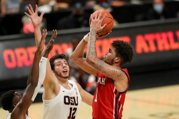 Utah's Timmy Allen (1) shoots over Oregon State's Warith Alatishe, left, and Roman Silva (12) during the first half of an NCAA college basketball game in Corvallis, Ore., Thursday, Feb. 18, 2021. (AP Photo/Amanda Loman)