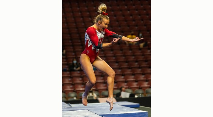 (Rick Egan | The Salt Lake Tribune) Abby Paulson competes on the floor for Utah in the PAC-12 Gymnastics Championship tournament at the Maverik Center, on Saturday, March 20, 2021.