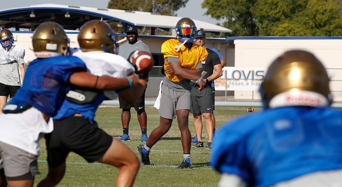 (Gary Kazanjian | Special to The Tribune) Clovis High School quarterback Nate Johnson, shown in the background, as his team as head coach Rich Hammond talks to the team at Clovis High School, who committed to play for the University of Utah, shown Wednesday, July 28, 2021, in Clovis, Calif.