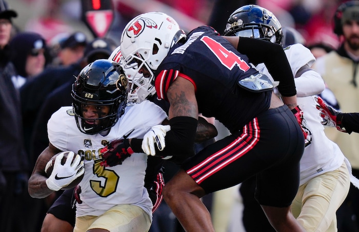 (Bethany Baker | The Salt Lake Tribune) Utah Utes running back Ja'Quinden Jackson (3) avoids a tackle from Colorado Buffaloes linebacker LaVonta Bentley (20) at Rice-Eccles Stadium in Salt Lake City on Saturday, Nov. 25, 2023.