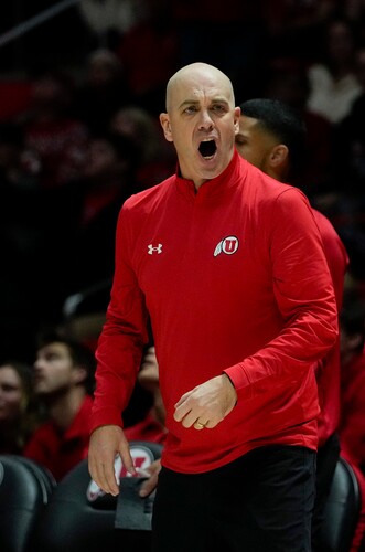 (Bethany Baker | The Salt Lake Tribune) Utah Utes head coach Craig Smith reacts to a call in the game against the Brigham Young Cougars at the Jon M. Huntsman Center in Salt Lake City on Saturday, Dec. 9, 2023.
