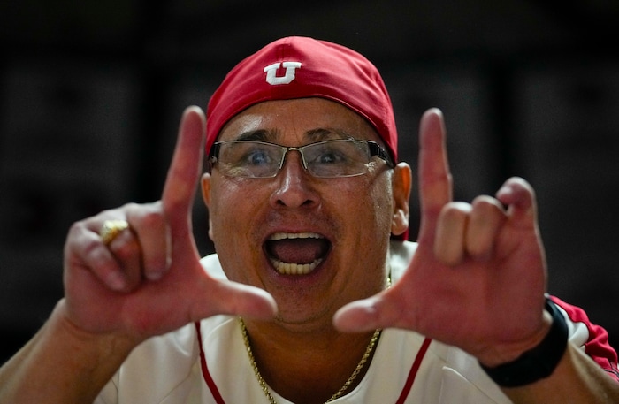 (Bethany Baker | The Salt Lake Tribune) A Utah Utes fans cheers during the game against the Brigham Young Cougars at the Jon M. Huntsman Center in Salt Lake City on Saturday, Dec. 9, 2023.
